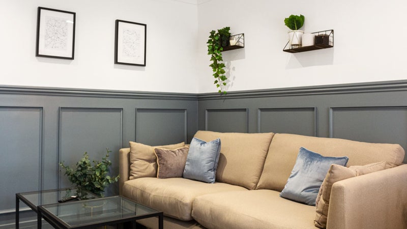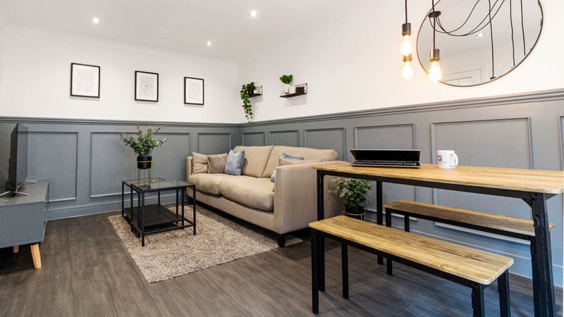 Swallowtails offers a double bedroom in a sophisticated luxury environment, with soft pastel colors, bespoke joinery, and stone worktops. The property features six stylish, fully furnished double bedrooms, two en-suites with large walk-in showers, and a modern main bathroom with a shower bath and ample storage space. The modern fitted kitchen includes integrated appliances and a large breakfast bar island. The lounge is a homely space with bespoke paneling, custom lighting, and access to a beautiful palm garden. Additional features include a downstairs W.C., fantastic parking facilities, and a large detached garage with a driveway.