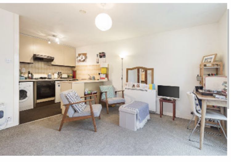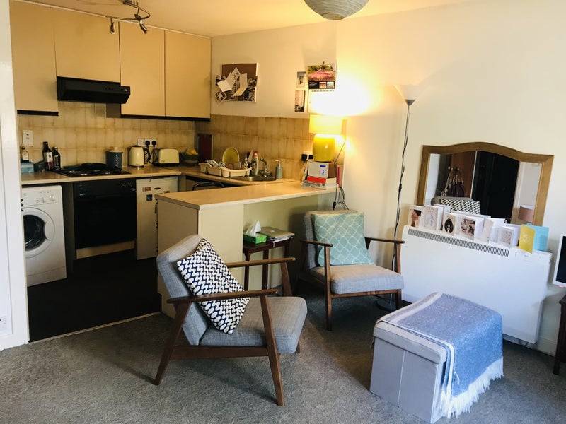 The studio apartment features a comfortable living space with a cozy atmosphere. The room is furnished with a bed, TV, breakfast bar, shelves, and fitted wardrobes for storage. The kitchen is equipped with essential appliances like a fridge freezer, washing machine, oven, kettle, and toaster. The bathroom includes a new electric shower, toilet, and a spacious sink with ample storage. The overall feel of the space is practical and functional, ideal for residents looking for a convenient living arrangement.