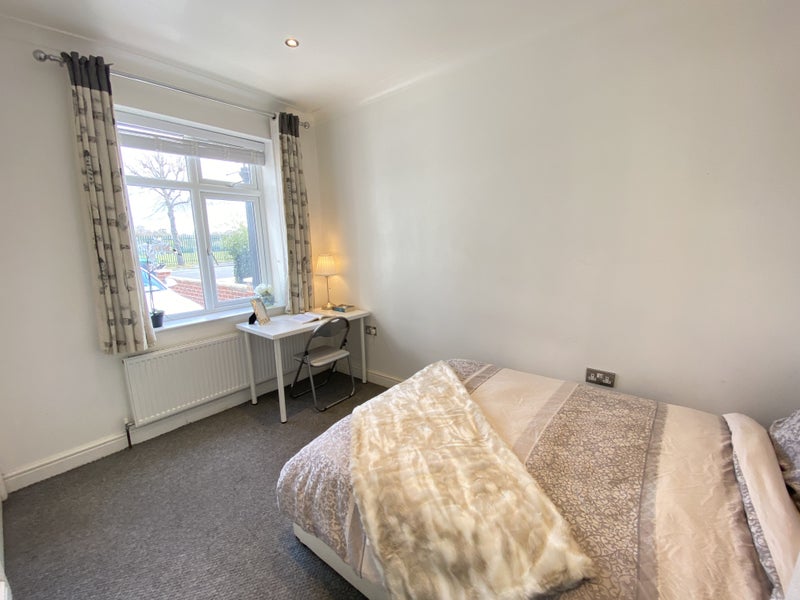 Room 2, situated on the ground floor, is bright and quiet, furnished with a double bed with ottoman storage, a built-in wardrobe, and space for additional storage or a desk. The house offers comfortable shared spaces, including a well-equipped kitchen diner and multiple bathrooms. The internet connectivity is excellent, ensuring everyone can enjoy streaming or working simultaneously.