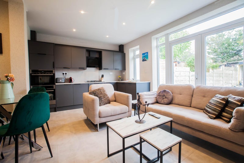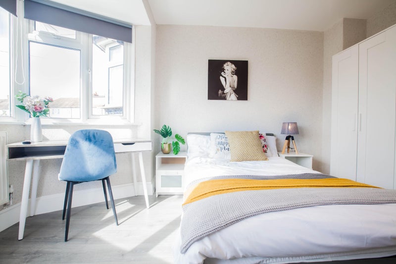This property offers 2 rooms for single occupancy, each priced at £950 per month. One room is a double with an en-suite bathroom, while the other is a double sharing a bathroom with one other room. All bills are included in the rent, making it a great value option with a low deposit requirement. The property features a large shared garden, parking space, and an additional shared lounge/dining area. Each room is located in a different house, both adjacent to each other and similar in layout and standards. Situated on the 1st floor, residents have access to shared laundry and cooking facilities, as well as a communal 65" TV for socializing.