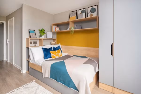 Studio rooms are self-contained rooms, come with a kitchen, bathroom and living space. It comes with a small double bed, under-bed storage, desk, chair and wardrobe. Here you will also have dual occupancy options with the following room options: